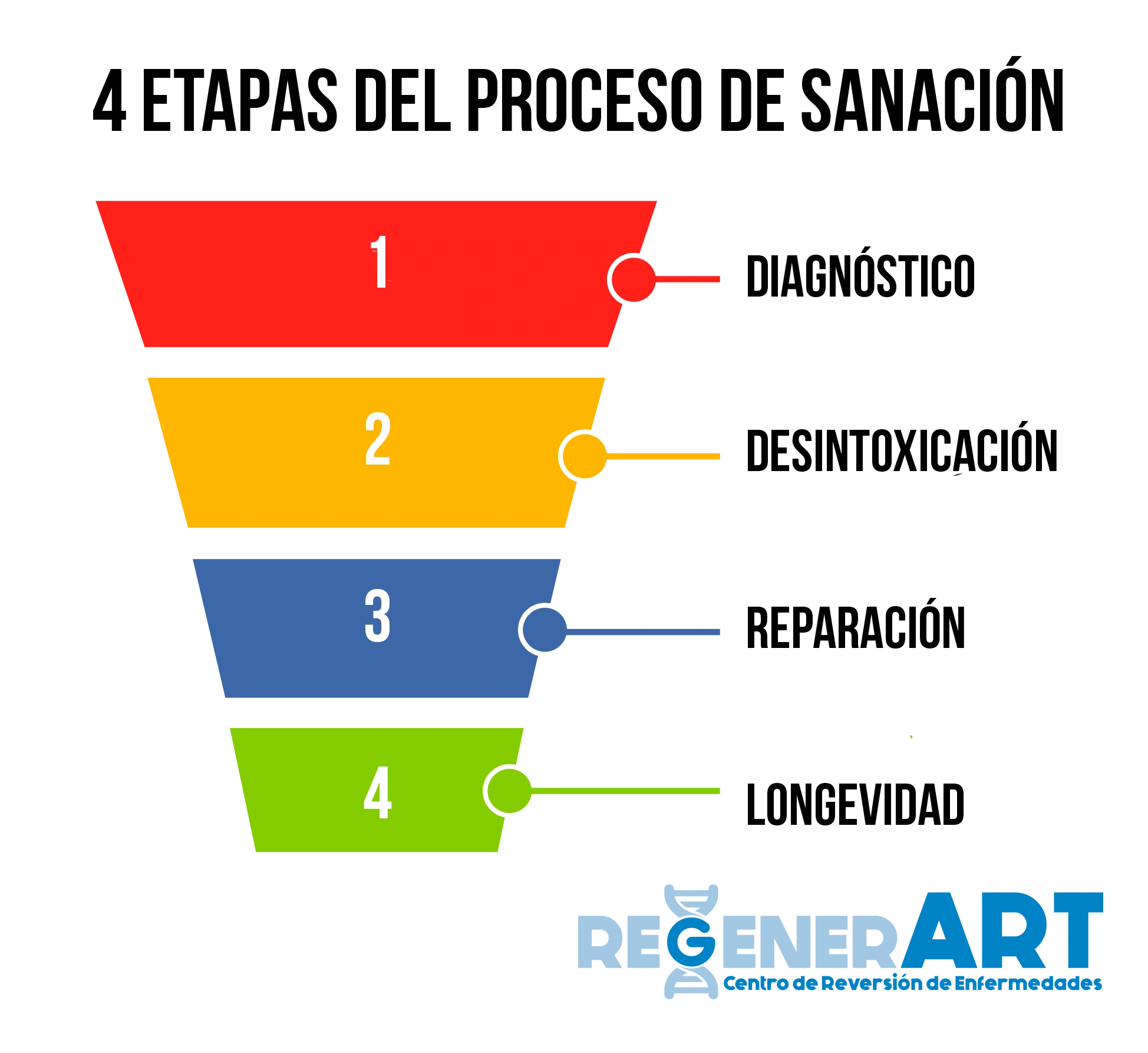 En Regenerart abordamos su proceso de sanación en cuatro etapas. Cada una de estas etapas son personalizadas y dependen de su situación de salud actual. Aquí vamos a tratar la causa o causas de sus enfermedades desde la visión holística de salud y con el empleo de terapias biológicas e integrativas.
